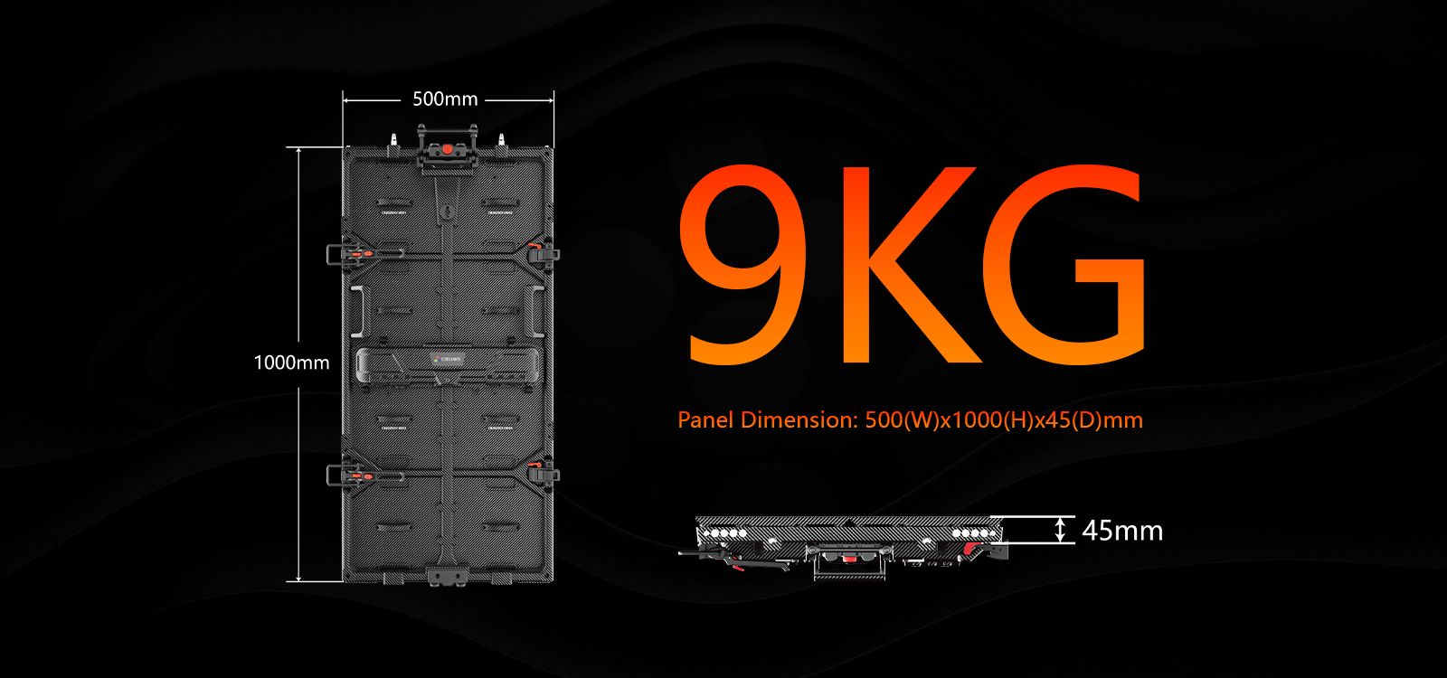 The CL carbon fiber series features an innovative full-carbon design with only 45mm thickness that delivers maximum strength while maintaining outstanding lightness — with 500x1000mm panels weighting just 8.5KG/PC and outdoor just 9KG/PC.This advanced construction effectively resists warping,minimizes vibration transmission,and extends product lifespan,making it ideal for demanding lightweight rental applications where both durability and portability are critical