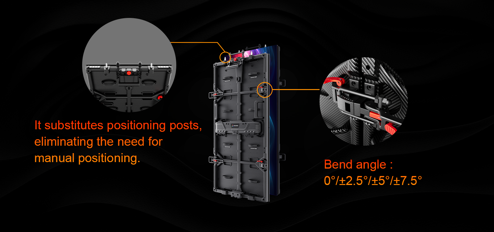 Fast Smart-lock system features high-strength king pins with auto-magnetic cabinet design and horizontal locking system that enables smooth adjustments ranging from -7.5° to +7.5°.The system saves up to 40% compared to the assembly time for regular LED panels with positioning posts while delivers speed, strength, and certainty in every connection.