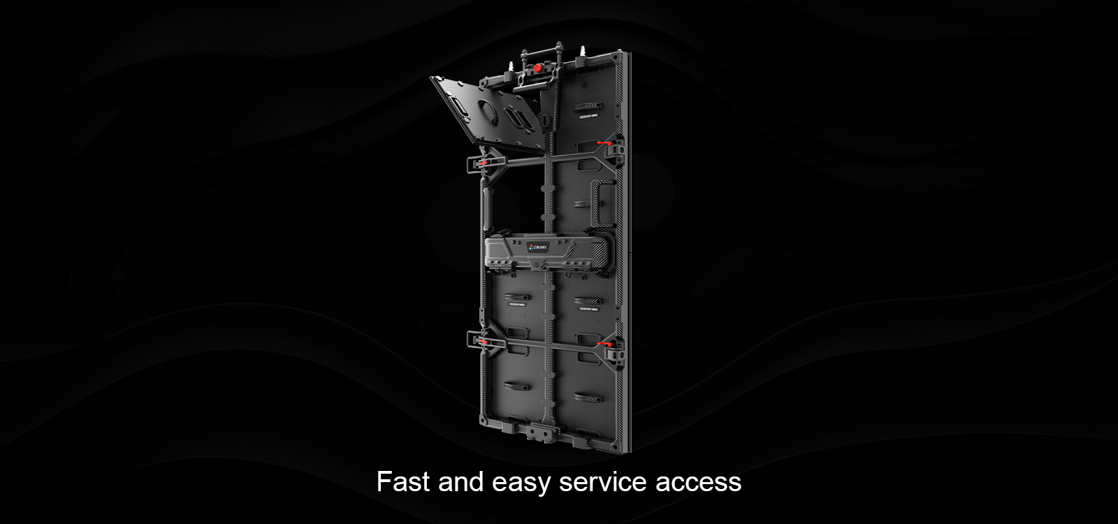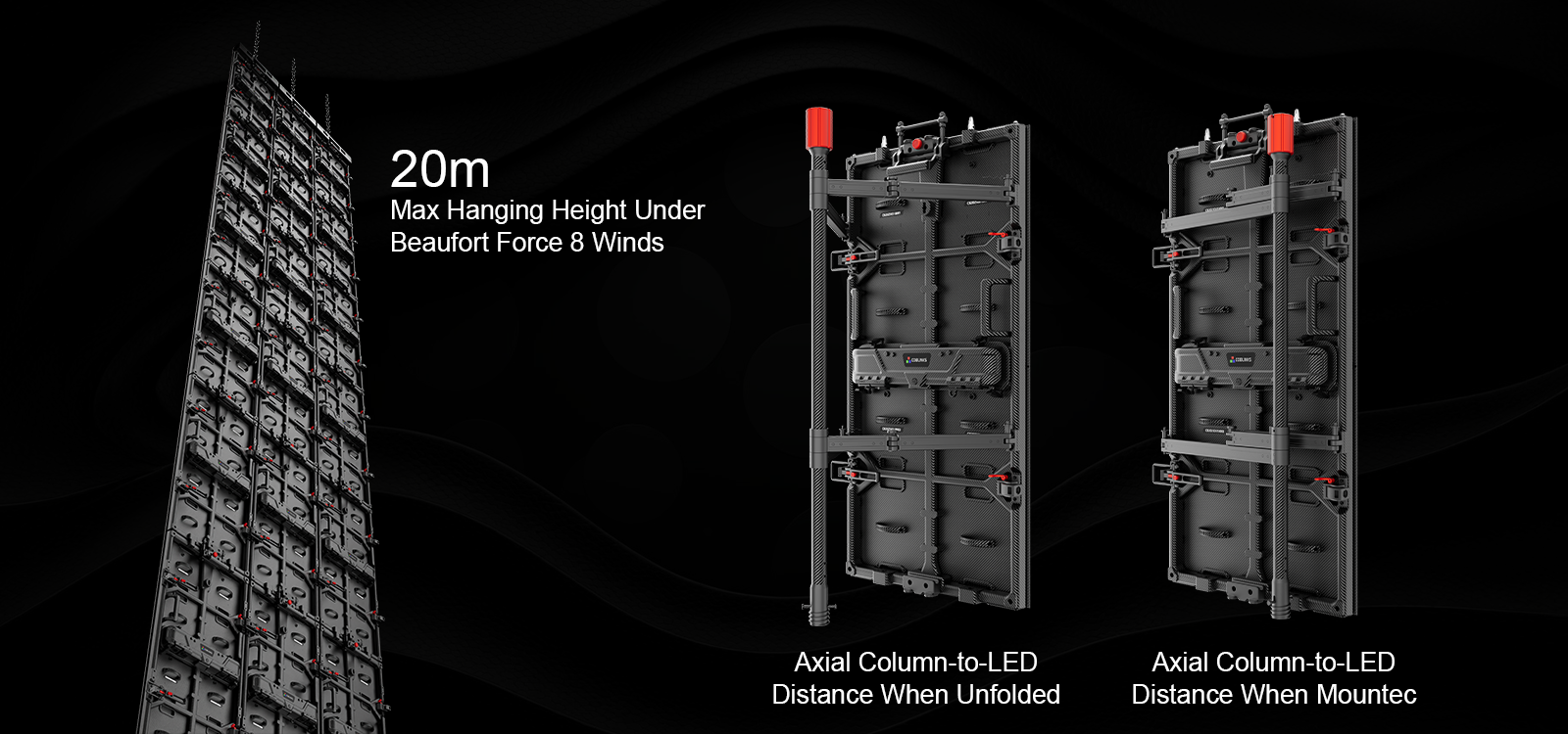 The CL panels can utilize an optional integrated wind-bracing system.When combined with reinforced hanging bars,it supports secure installation up to 20meters high.The modules,power box and receiving card are all mounted directly on the rigid frame,creating a fully integrated LED solution offering higher precision and less weight than conventional systems.